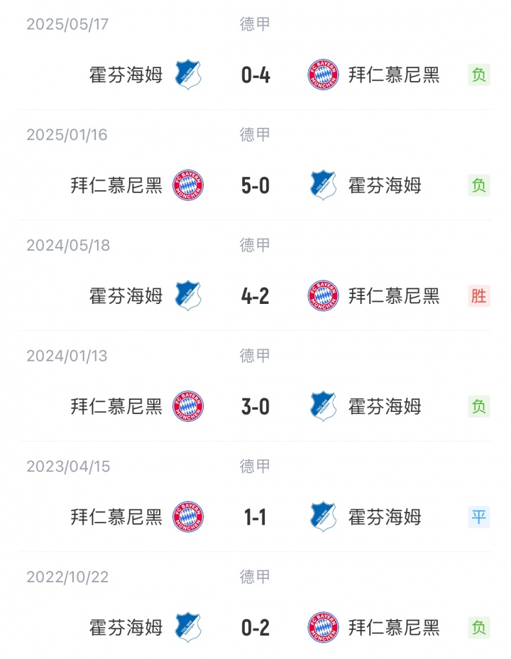 拜仁德甲3连胜积9分位列榜首;霍芬海姆2胜1负暂列德甲第6。