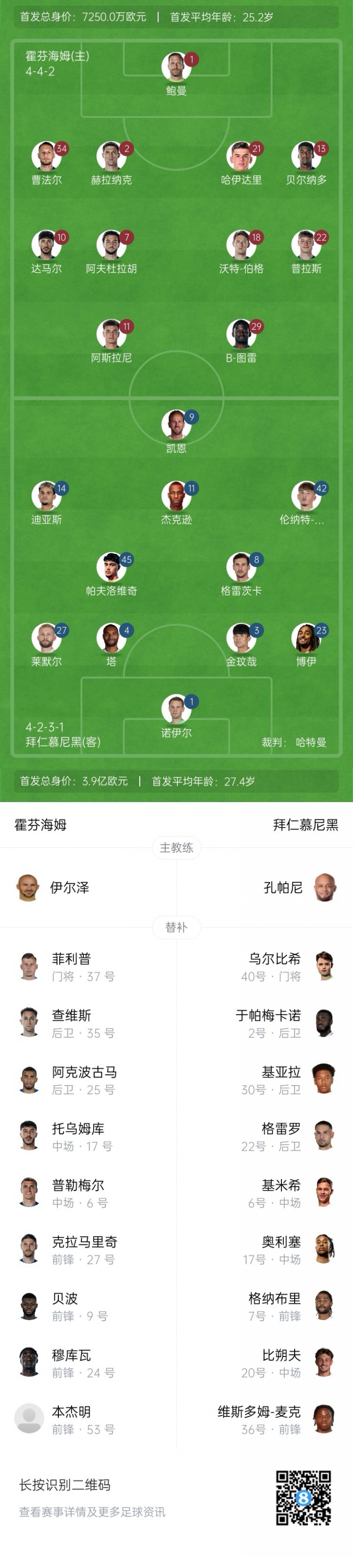 霍芬海姆首发:1-鲍曼、2-赫拉纳克、13-贝尔纳多、34-曹法尔、21-哈伊达里、7-阿夫杜拉胡、10-达马尔、18-沃特-博格、22-普拉斯、11-芬斯尼克-阿斯拉尼、29-B-图雷