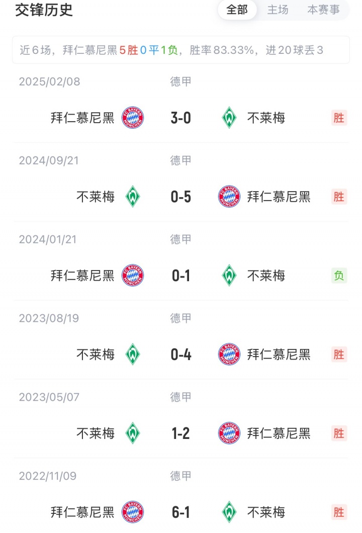拜仁联赛开局四连胜领跑。不莱梅1胜1平2负,暂排第12名。