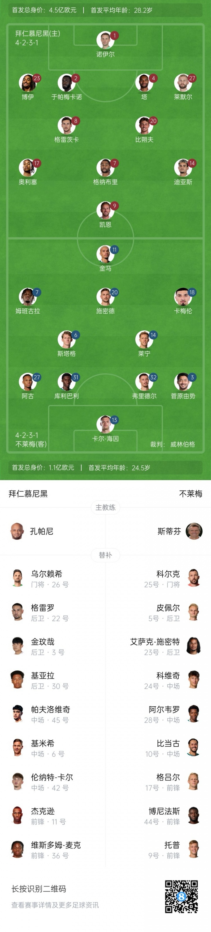 拜仁替补:26-乌尔赖希、3-金玟哉、6-基米希、11-杰克逊、22-格雷罗、30-卡西亚诺·基亚拉、36-维斯多姆·麦克、42-伦纳特·卡尔、45-帕夫洛维奇